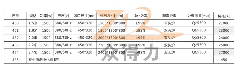 本系列油煙凈化一體機(jī)有1.5米、1.8米、2.0米、2.2米和2.4米五種規(guī)格,價格詳情請看下圖參數(shù):
